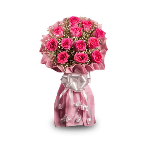 Arrangement of 14 pink roses, 3 White Roses, 12 purple Orchids. All arranged beautifully on handle basket as shown in the image.