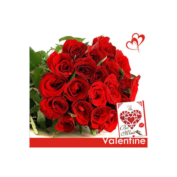 Bunch of 20 Red Roses with a romantic valentine greeting card.