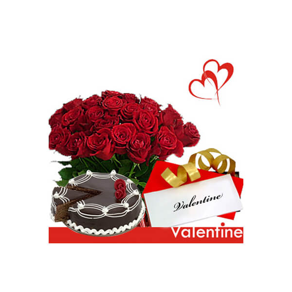 Bunch of 20 Red Roses and 500gm chocolate cake and a valentine greeting card.