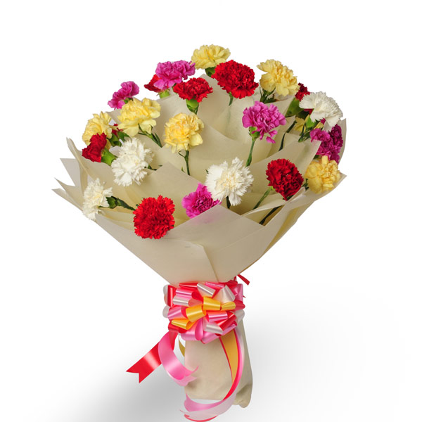 Bunch of 25 mix color (Red, Pink, White, yellow) Carnations in a white paper packing with mix color ribbon.