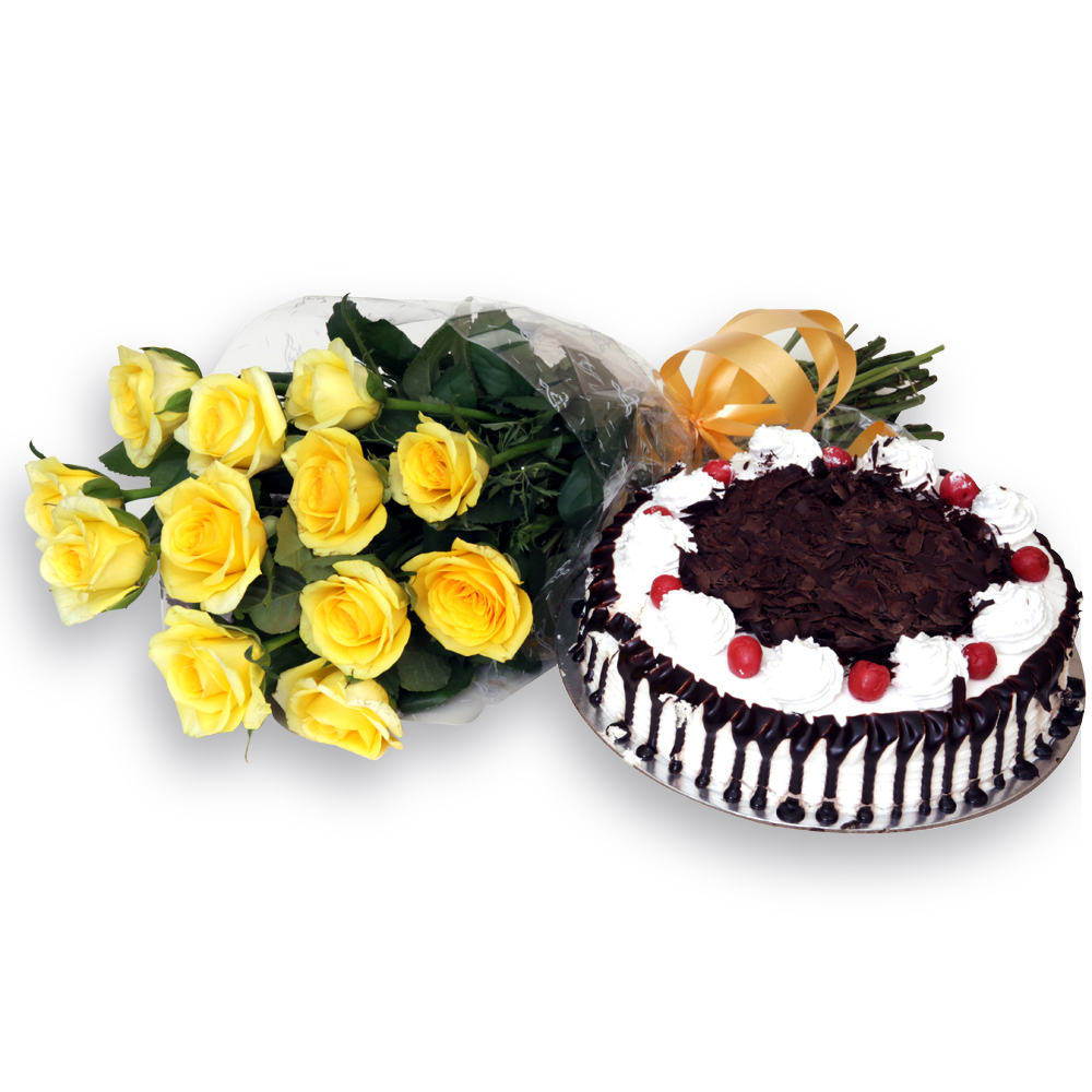 Bunch of 12 Yellow Roses in a cellophane packing with yellow ribbon and 500gm Blackforest Cake.
