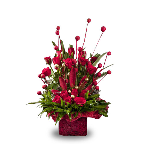20 red roses gorgeously arranged in an exclusive love arrangement decorated with lots of red dry fillers as well as green fillers in rectangular glass vase covered with red jute.